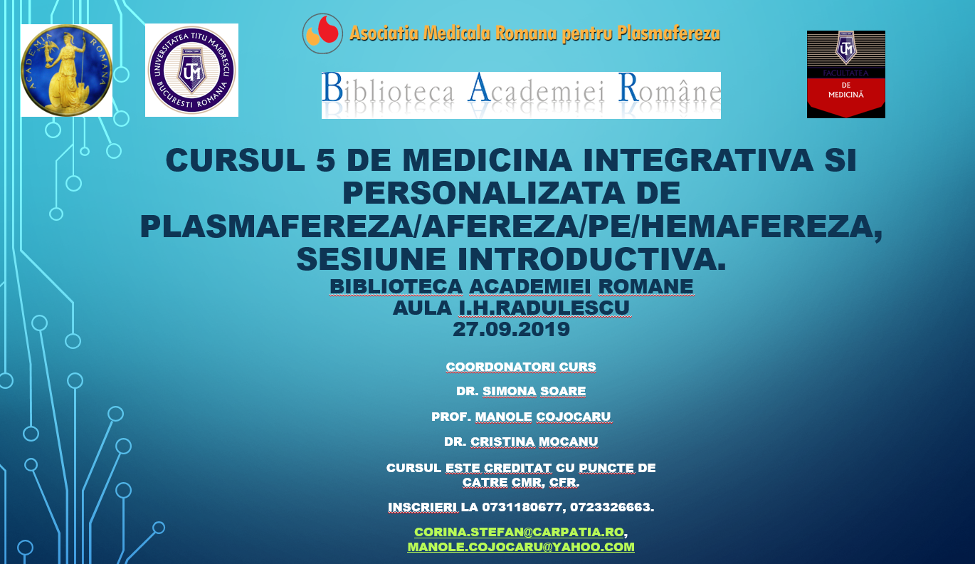 CURSUL 5 DE MEDICINA INTEGRATIVA SI PERSONALIZATA DE PLASMAFEREZA / AFEREZA/PE / HEMAFEREZA, sesiune introductiva