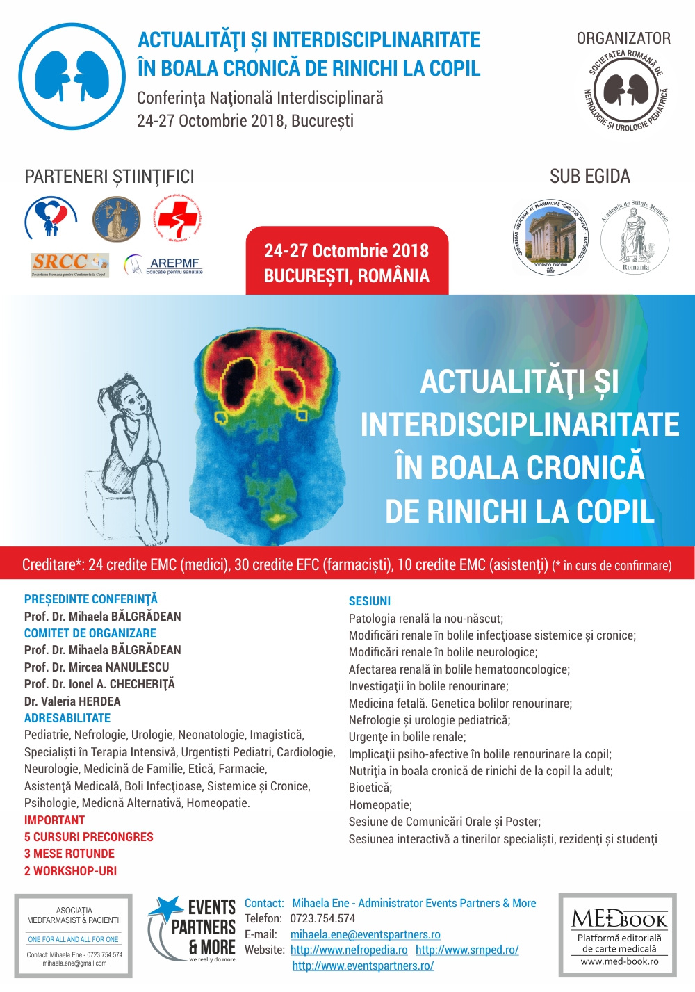 Afisari: 3813In perioada 24-27 octombrie 2018, va avea loc la Bucuresti cea de a II-a editie a Conferintei Nationale Interdisciplinare de Nefrologie si Urologie Pediatrica cu tema ACTUALITATI SI INTERDISCIPLINARITATE IN BOALA CRONICA DE RINICHI, LA COPIL, Organizator - SRNUP, Presedinte- Prof. Dr. Mihaela Balgradean/Sp. “M. S. Curie”Bucuresti.