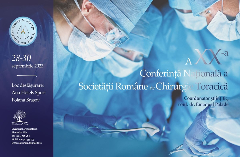 Afisari: 967Vă invităm la cea de-a XX-a conferință națională a Societății Române de Chirurgie Toracică, ce va avea loc în perioada 28-30 septembrie 2023, la Poiana Brașov, Hotel Hotels Sport.