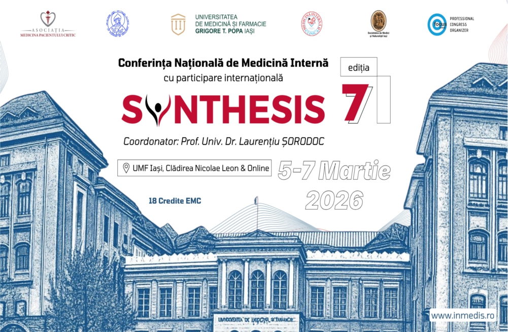 Am deosebita plăcere să vă invit la cea de-a șaptea ediție a Conferinței Naționale de Medicină Internă „SYNTHESIS”, care va avea loc la Iași, în perioada 5–7 martie 2026. Evenimentul se va desfășura în format fizic, în cadrul Universității de Medicină și Farmacie „Grigore T. Popa” Iași, beneficiind totodată de transmisie online pentru a permite participarea unui număr cât mai mare de colegi din întreaga țară.
