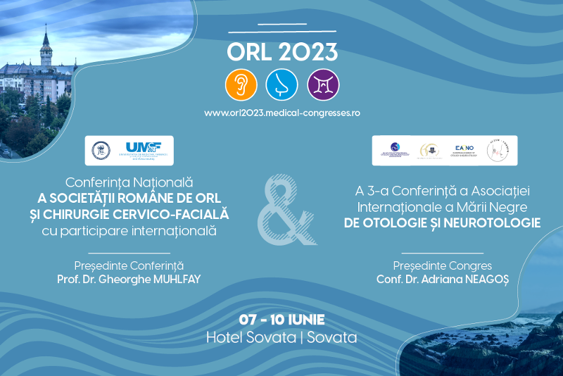 Ne face nespusă plăcere să vă invităm la o nouă ediție a Conferinței Naționale de Otorinolaringologie și Chirurgie Cervico-Facială cu Participare Internațională & Al 3-lea Congres al Asociației de Otologie și Otoneurologie al Țărilor Mării Negre, ce se va desfășura în perioada 07 – 10 Iunie 2023 la Hotel Sovata din Sovata!