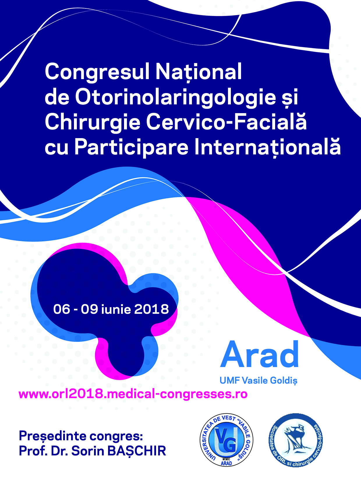 Avem bucuria de a vă ura bun venit la Congresul Național de Otorinolaringologie și Chirurgie Cervico-Facială cu Participare Internațională, ce se va desfășura în perioada 06-09 Iunie 2018, la Universitatea de Vest ‘Vasile Goldiş’. Manifestarea se organizează sub egida Societăţii Române de Otorinolaringologie şi Chirurgie Cervico-Faciala (SORLCCF), având alături de noi şi Universitatea de Vest “Vasile Goldiş” Arad.