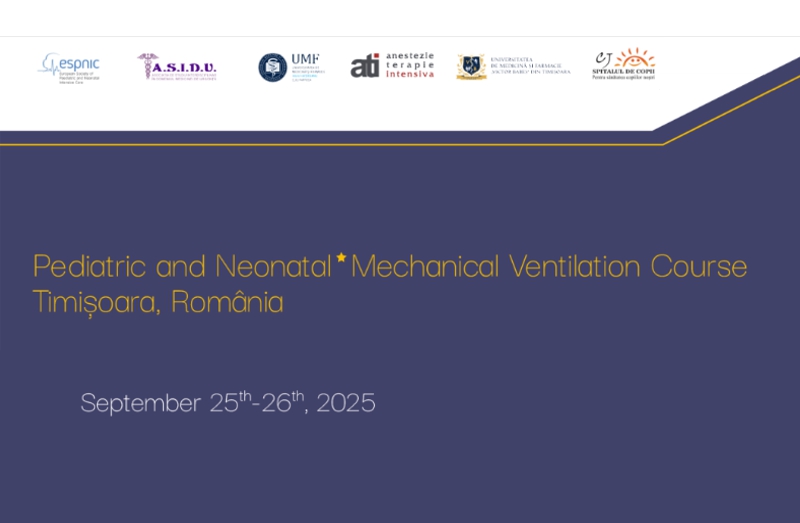 Vă informăm că, în perioada 25-26 septembrie 2025, va fi organizată o nouă ediție a Cursului de Ventilație Mecanică Pediatrică și Neonatală, la Timișoara, în cadrul celei de-a 23-a ediții a Cursului Internațional de Ghiduri și Protocole în Anestezie, Terapie Intensivă și Medicină de Urgență (GPATI).