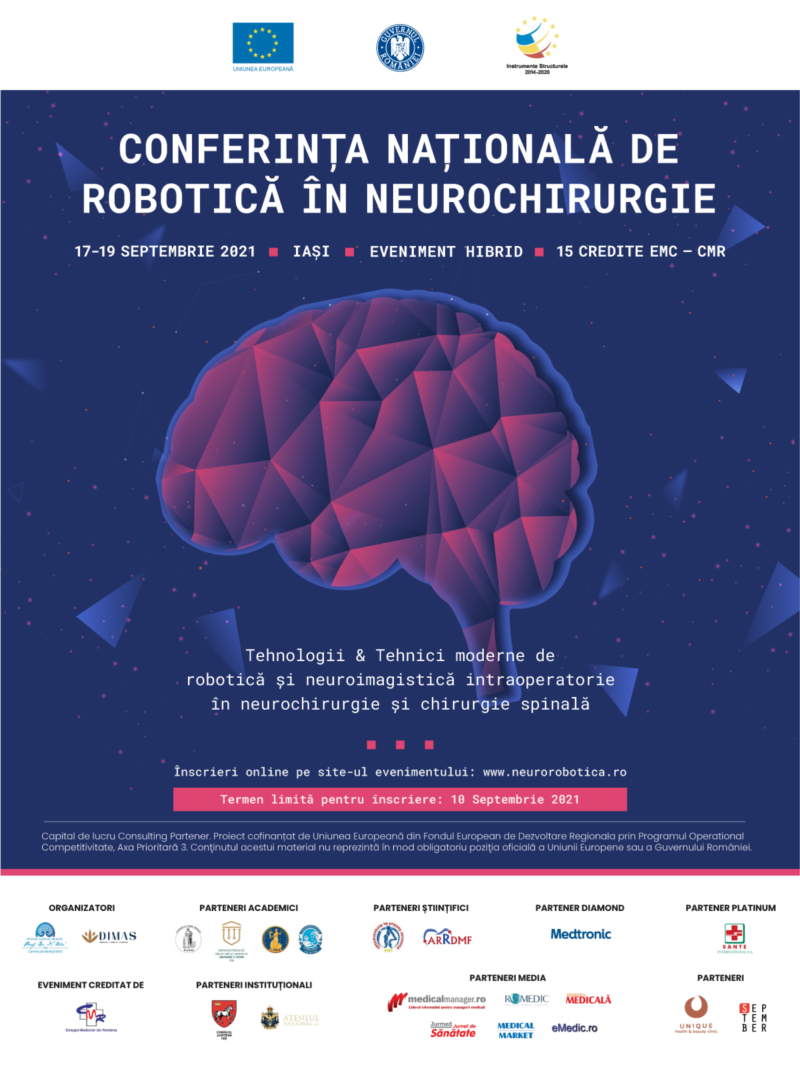 Nu uitați să marcați în calendarul activităților dumneavoastră zilele de 17-19 septembrie 2021, ca fiind ocupate cu lucrările Conferinței Naționale de Robotică în Neurochirurgie „Tehnologii & Tehnici moderne de robotică și neuroimagistică intraoperatorie în neurochirurgie și chirurgie spinală”.