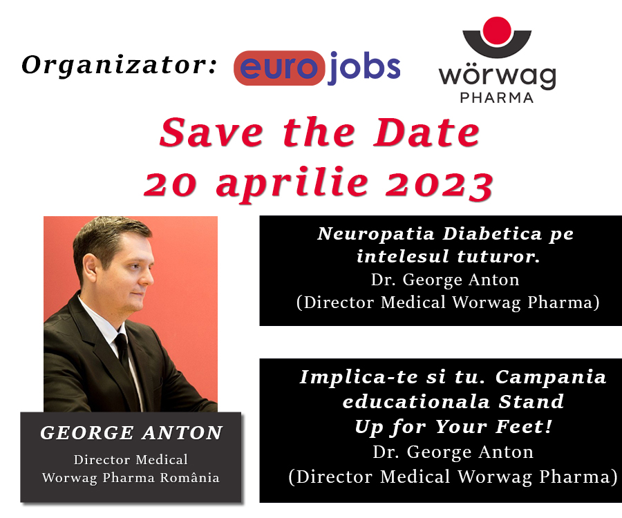 Afisari: 1090EURO JOBS si WORWAG Romania organizeaza in perioada 20-21 aprilie 2023 cursul eveniment de formare profesionala pentru ASISTENTI MEDICALI si DIRECTORI DE INGRIJIRI MEDICALE cu tema “Neuropatia diabetica: manifestari, diagnostic, tratament si asistenta medicala”.