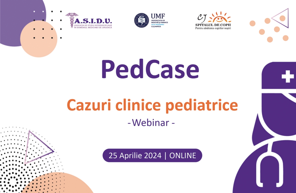Anul acesta, Asociația de Studiu Interdisciplinar în Domeniul Medicinei de Urgență are plăcerea de a vă invita la PedCase 2024 – Cazuri clinice pediatrice – un webinar care va avea loc în 25 Aprilie 2024, exclusiv online si care dorește să aducă în atenția dumneavoastră o serie de situații și experiențe din practica specialiștiilor Spitalului de Copii din Cluj-Napoca – partener oficial al acestei manifestări.