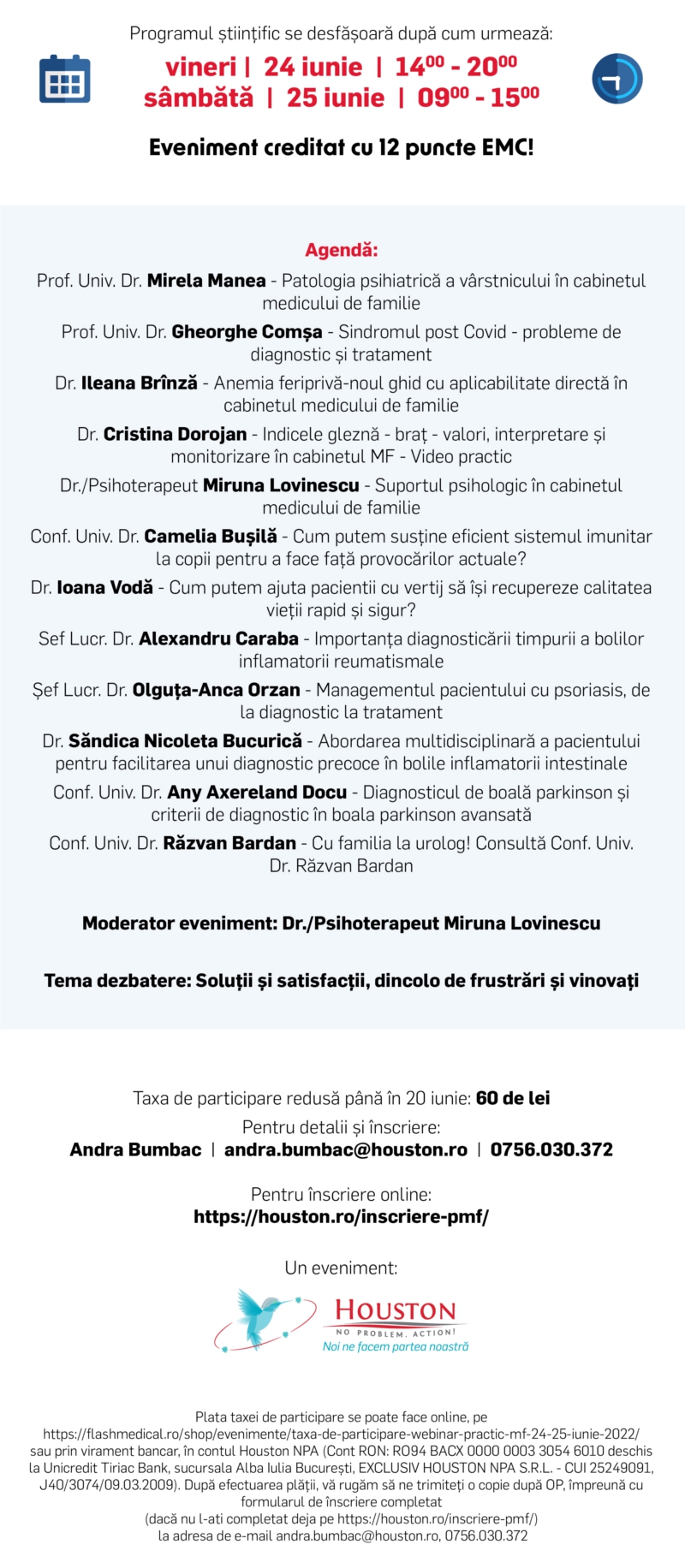 Înscrieți-vă și beneficiați de timp de calitate alături de colegi ce vin și împărtășesc soluții eficiente, verificate, cu rezultate și informații sintetizate, actualizate despre prevenție, diagnosticare, tratament și monitorizare în cabinetele de medicină de familie.