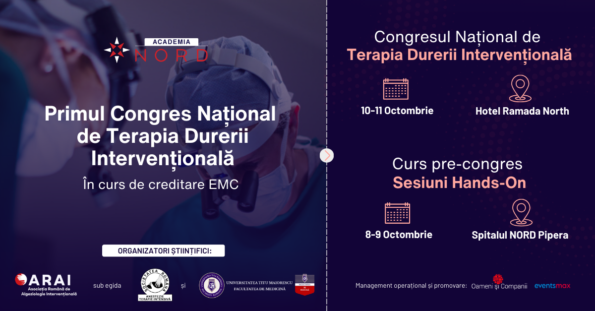 Programul Congresului include și un Curs pre-congres cu sesiuni hands-on ghidate fluoroscopic și ecografic, ce va avea loc pe 8-9 octombrie la Spitalul NORD Pipera. Cursul va oferi participanților oportunitatea de a învăța și aplica tehnici de ultimă oră, sub îndrumarea directă a celor mai renumiți experți în domeniu.