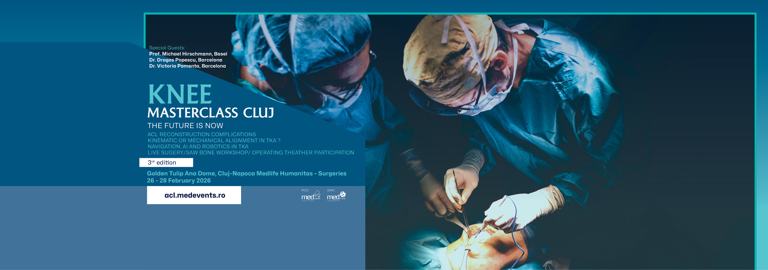 The 3rd Edition of the Knee Masterclass will take place between 26–28 February 2026 in Cluj-Napoca, with sessions hosted at Golden Tulip Ana Dome, and live surgeries performed at MedLife Humanitas.
