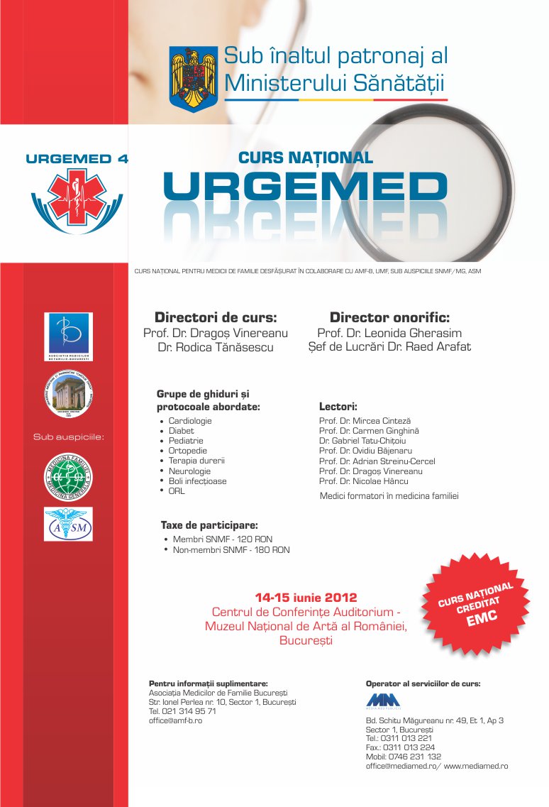 Asociatia Medicilor de Familie- Bucuresti si Universitatea de Medicina si Farmacie „Carol Davila” Bucuresti organizeaza in perioada 14-15 Iunie 2012, cursul national URGEMED 4 la Centrul de Conferinte Auditorium, Muzeul National de Arta al Romaniei, Bucuresti.