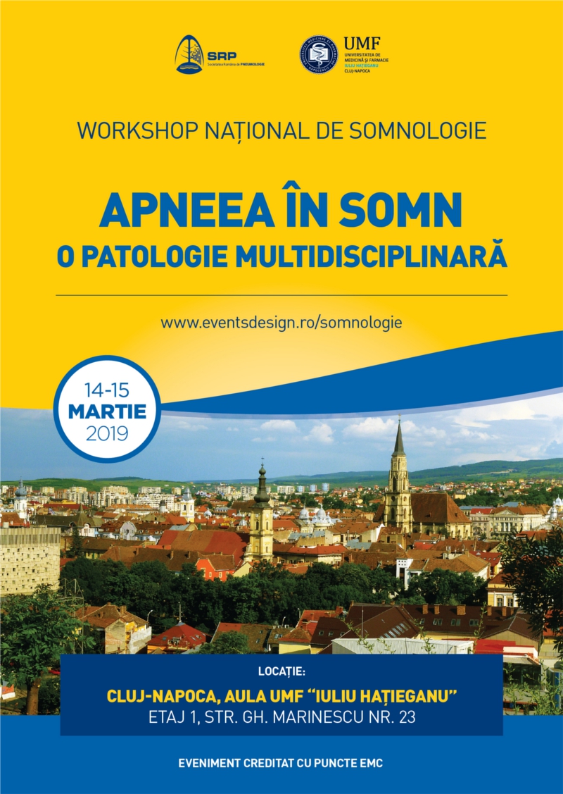 În numele Comitetului de Organizare, am deosebita plăcere şi onoare de a vă invita să participaţi la Workshop-ul Naţional de Somnologie „Apneea în Somn – O Patologie Multidisciplinară”, care se va desfăşura la Cluj-Napoca, între 14 şi 15 martie 2019, la Aula UMF “Iuliu Haţieganu”, Etaj 1, Str. Gh. Marinescu nr. 23.
